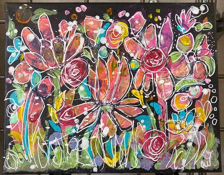 In this unique class, you will start with a "chaos" layer that you create using colors of your choice. Then, using black or white or any color you wish, you will paint what's called the negative space - the space around the flowers, allowing the painting to emerge from the chaos. Very fun! All supplies provided.