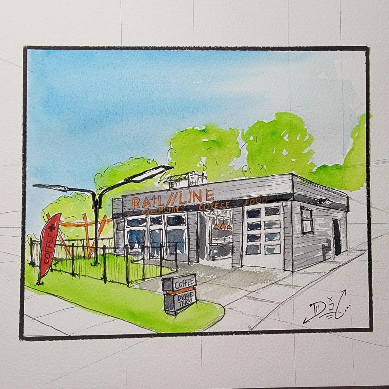 In this class Dan will walk you through the process of drawing In 2-point perspective. We will be drawing the Rail//Line coffee shop and adding just a pop of color at the end of the class. This is a class for ages 14 and older. Younger than 14 are welcome to take the class if an adult takes the class with them.