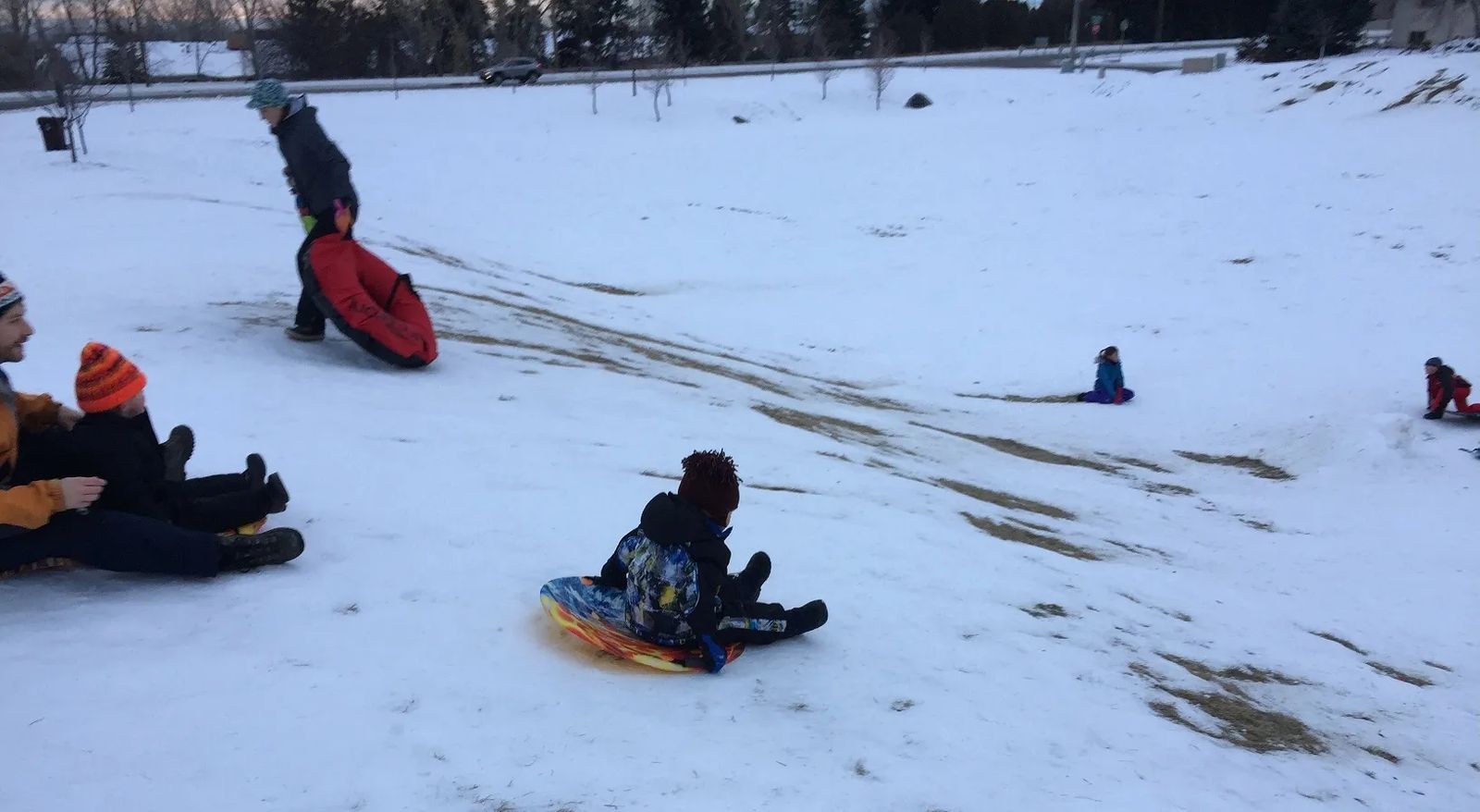 With a street on either side, there’s plenty of parking at the top of the hill. The sledders then slide toward the center. Don’t worry, the opposite hill is far enough away that you’re not going to be smashing into each other.