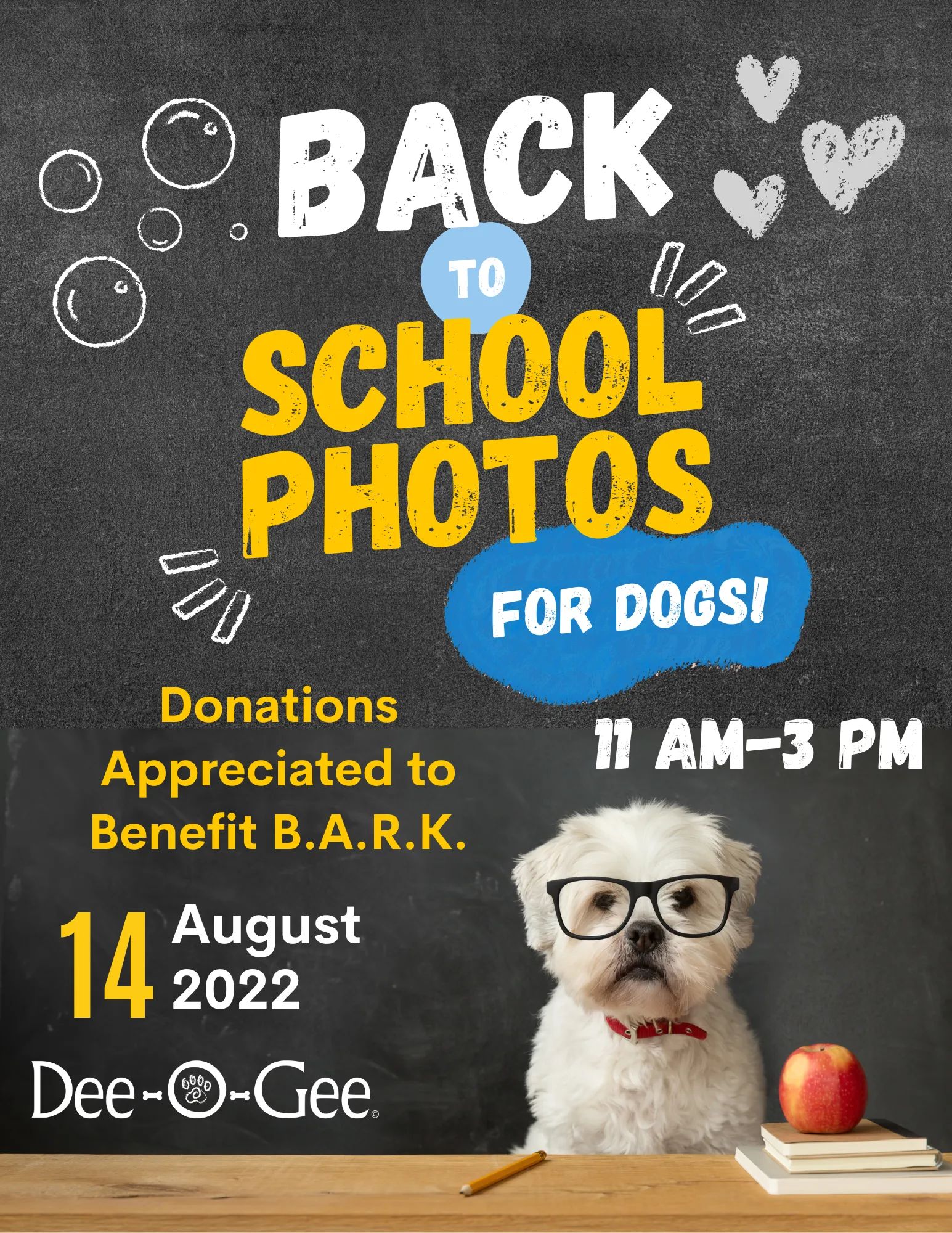 Join us, B.A.R.K., and Casey Page for a doggy Back to School photoshoot! We will have lots of props to make sure it feels just like picture day in school! There is no registration or fee for this event, but we are graciously accepting donations to benefit Billings Animal Rescue Kare.