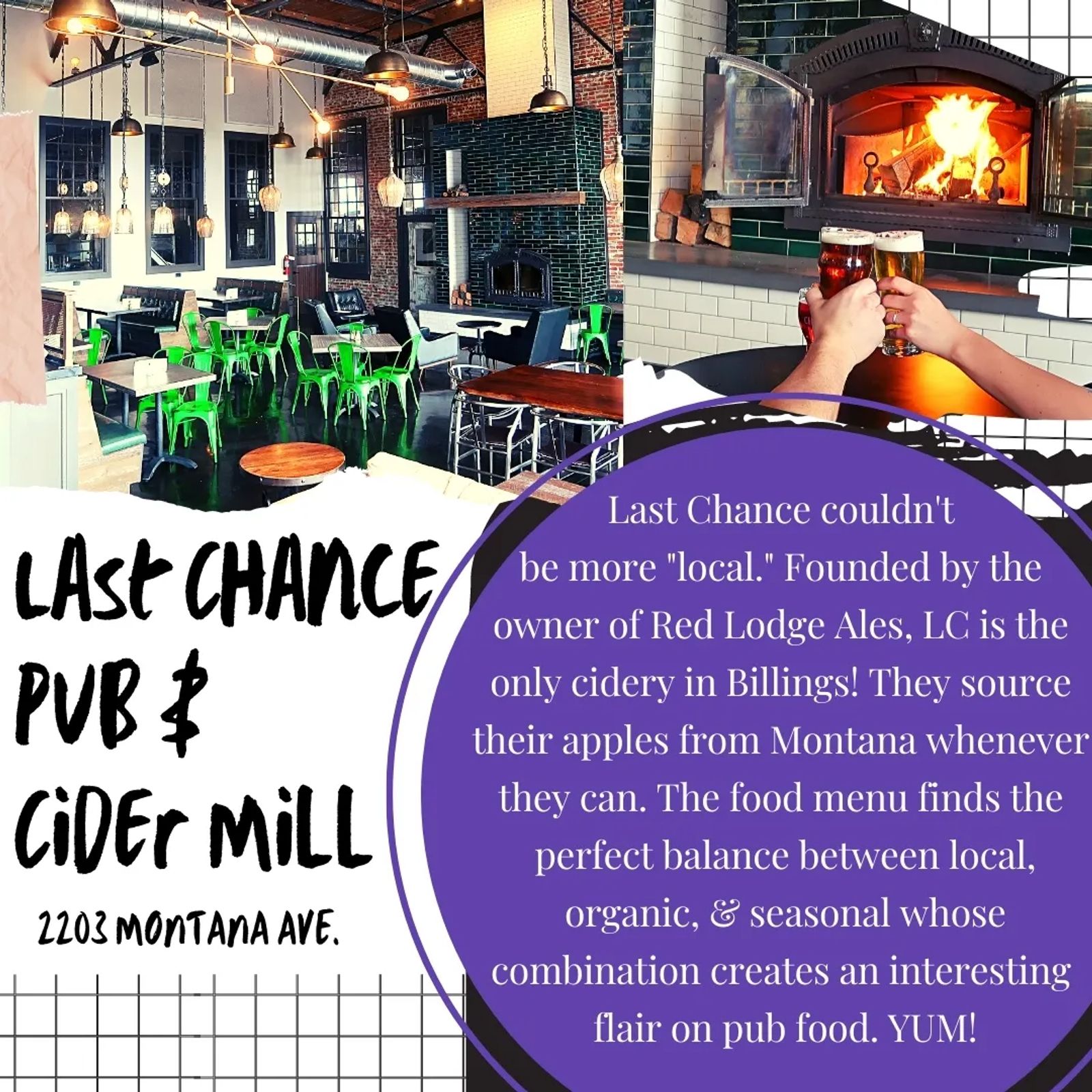 Last Chance couldn't be more "local." Founded by the owner of Red Lodge Ales, LC is the only cidery in Billings! They source their apples from Montana whenever they can. The food menu finds the perfect balance between local, organic, & seasonal whose combination creates an interesting flair on pub food. YUM!
