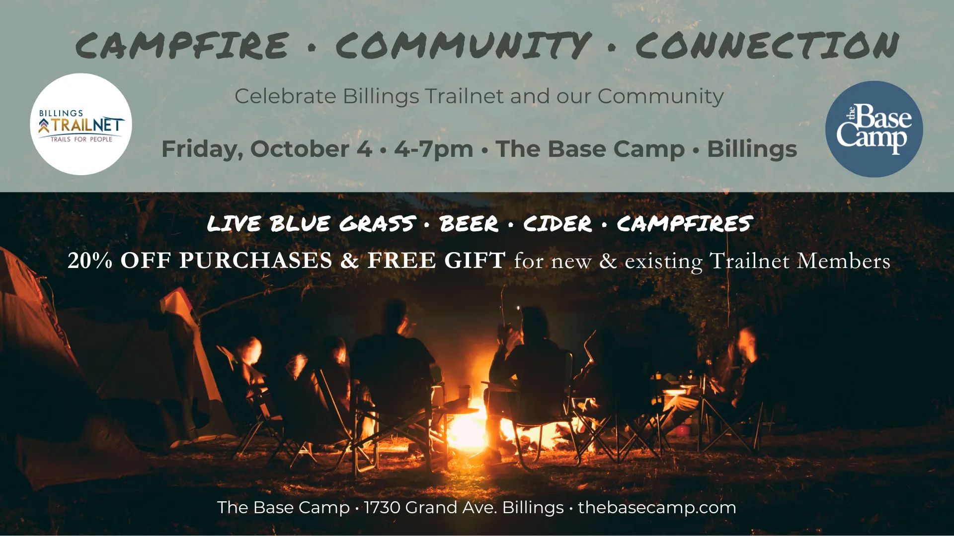 Join us for this FREE EVENT: Campfire • Community • Connection at the Billings Base Camp on Friday, October 4th, from 4-7pm. This special event benefits Billings TrailNet and is all about bringing the community together. Enjoy beer, cider, campfires, and live bluegrass music while shopping for great clothing, footwear gifts and gear! Plus, all new or existing TrailNet members get 20% OFF their entire purchase and a free gift (while supplies last) for joining the fun! All are welcome.
