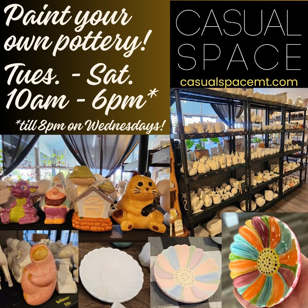 One of the most popular experiences inside Casual Space is pottery painting. Guests of all ages enjoy choosing a piece and creating something uniquely their own. This offering is made possible through a partnership with local potter Chris of Hands Earth Craft, who helps bring the pottery painting program to life.