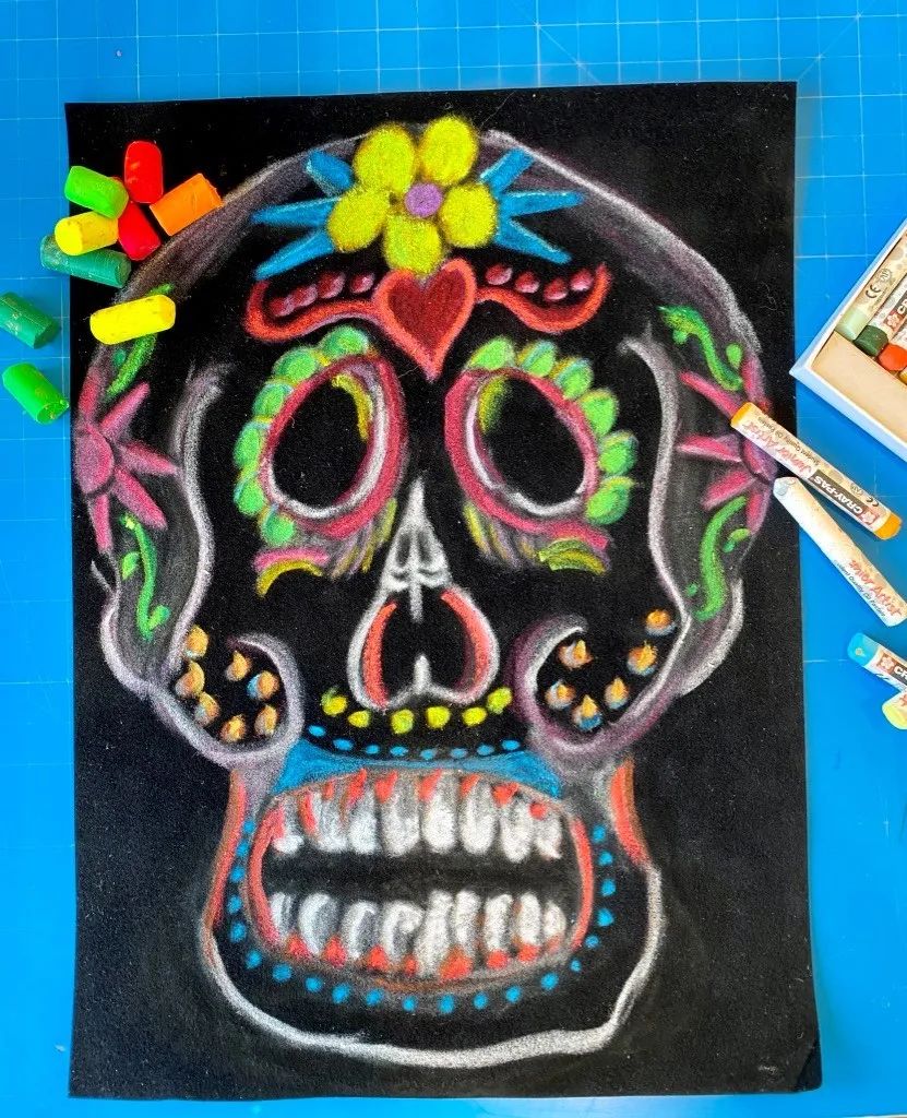 We’ll use a template for the basic skull shape, then go wild...the more colorful the better! Oh, did I say we are using velvet paper? The effect is very dramatic.