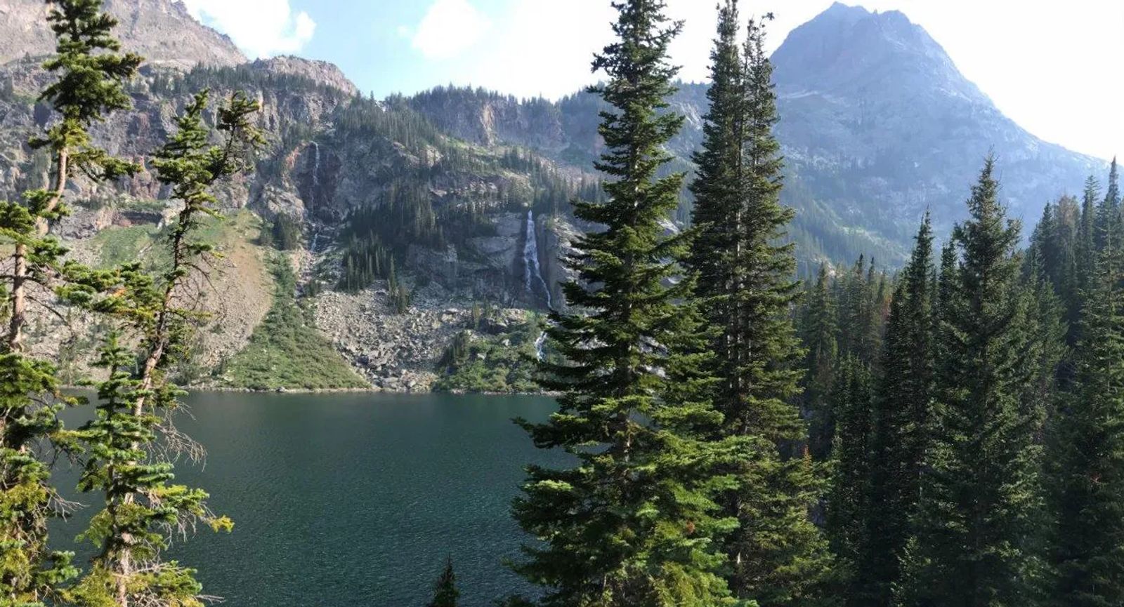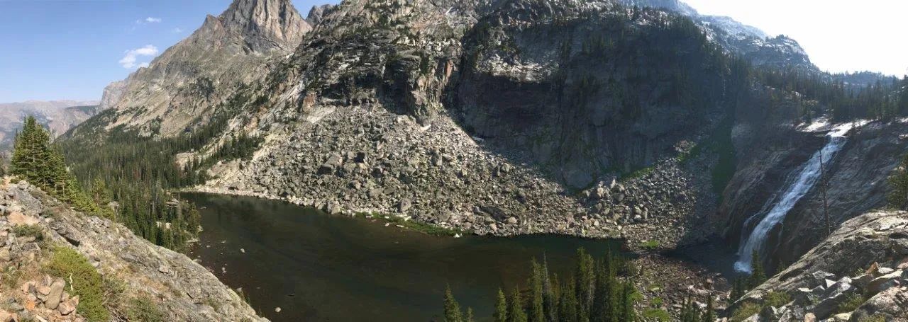 Of course if you like the scenery at Rainbow, you might as well keep going another mile to Lake at Falls. Because here, you get spectacular cliffs on the far side of the lake that host two beautiful waterfalls as the water spills down from Martin Lake 1,000 feet higher.