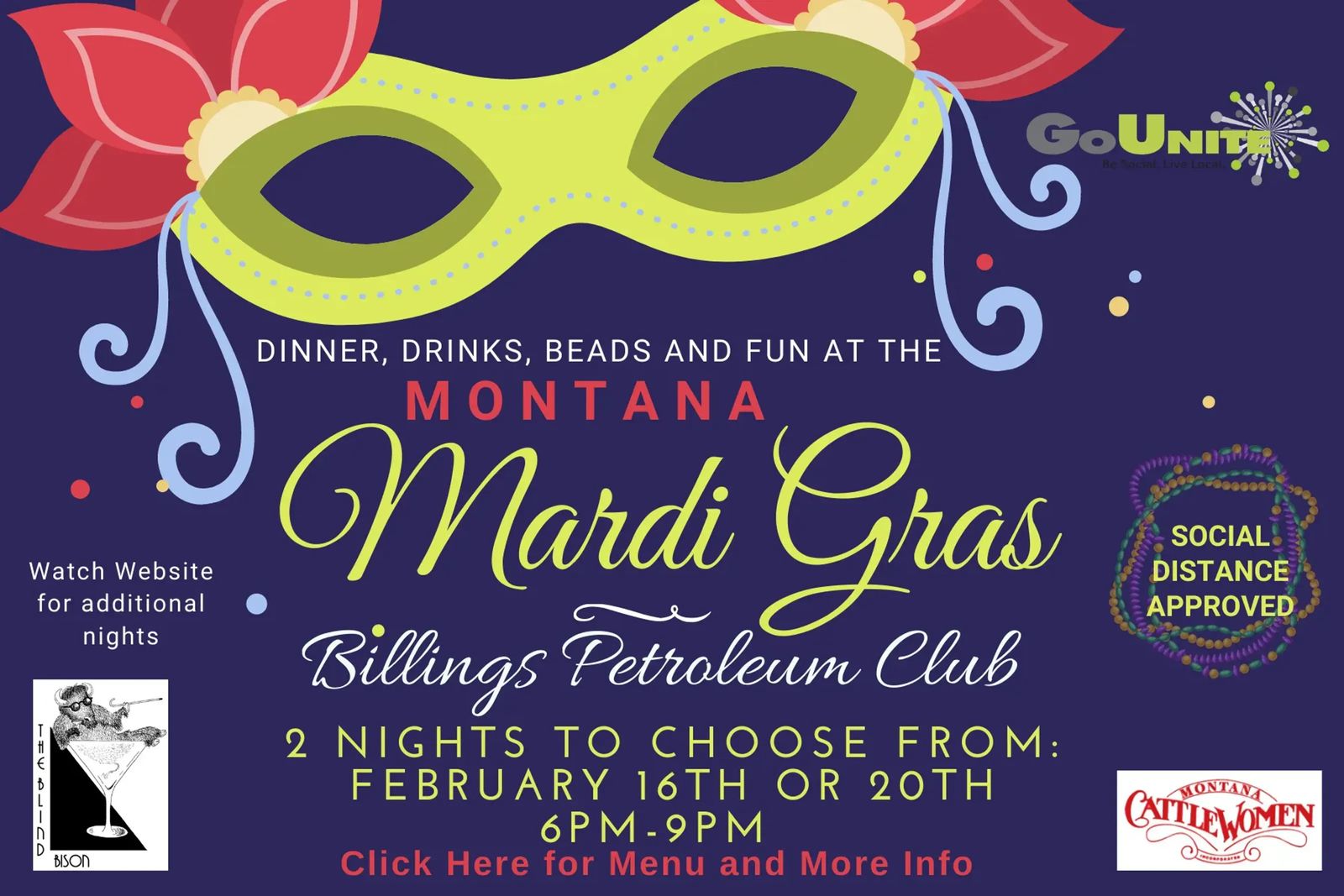 We are teaming up with Montana Cattlewomen at Billings Petroleum Club to bring a taste of The Big Easy to Billings! We will have Cajun inspired food, beads, and kings cake! In addition, our friends from the Blind Bison will teach us the art of making some festive Fat Tuesday cocktails. There will be lots of color, laughter, and fun as we celebrate our first in person event of the New Year!