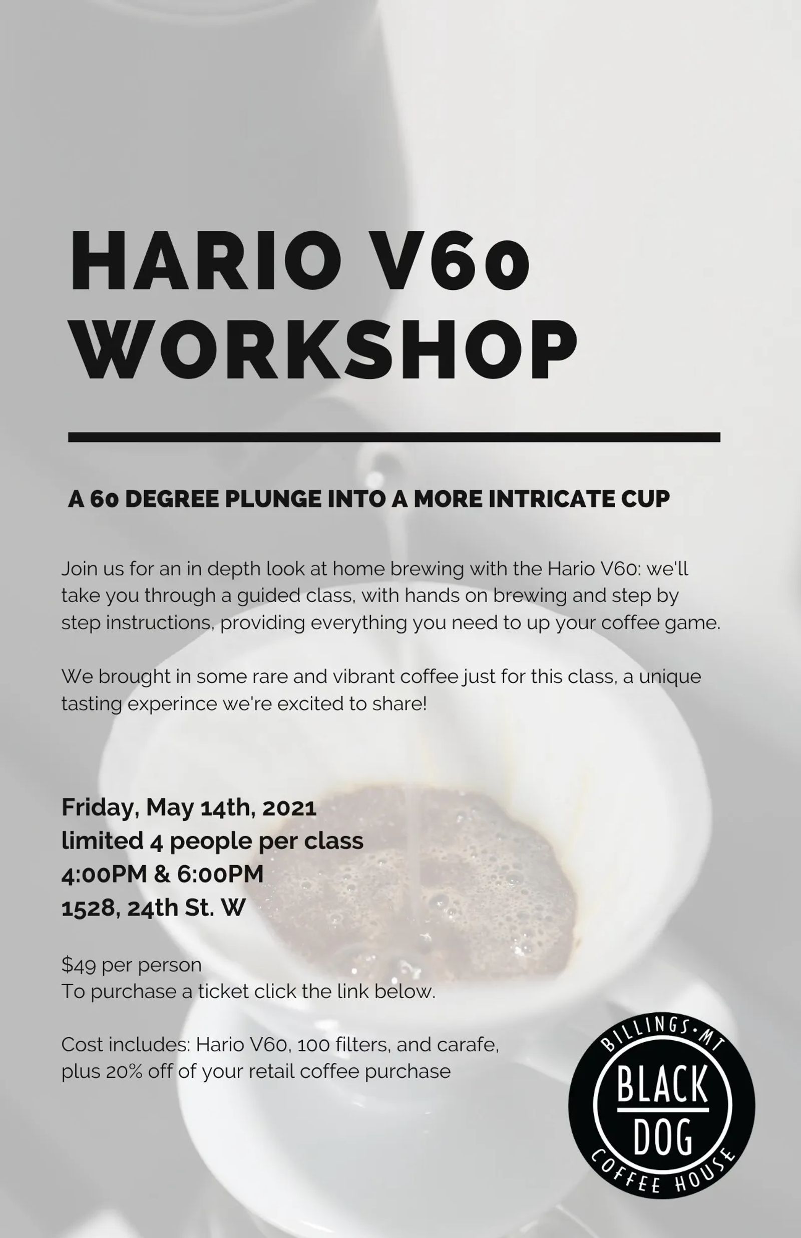 $49 a person, cost includes Hario V60, 100 filters, and carafe. Plus 20% off of your retail coffee purchase.