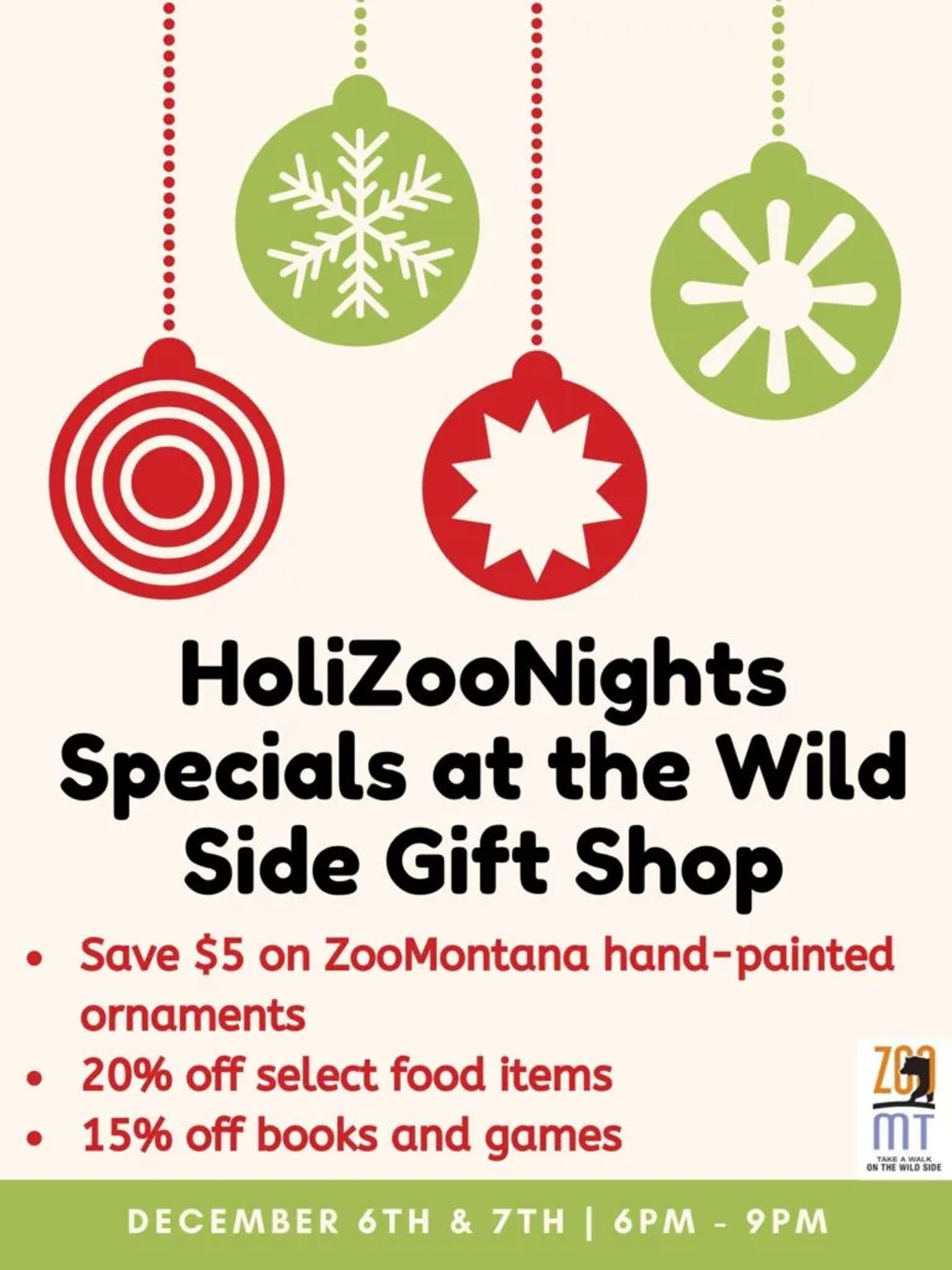 Stop by the Wild Side Gift Shop before you do ZooLights or after (or you don’t even have to do ZooLights) to see Santa! FREE photos by Vande’ Studios. Enjoy some holiday shopping specials at the Wild Side Gift Shop. Cookie decorating and holiday card/gift bag stamping for the kids.