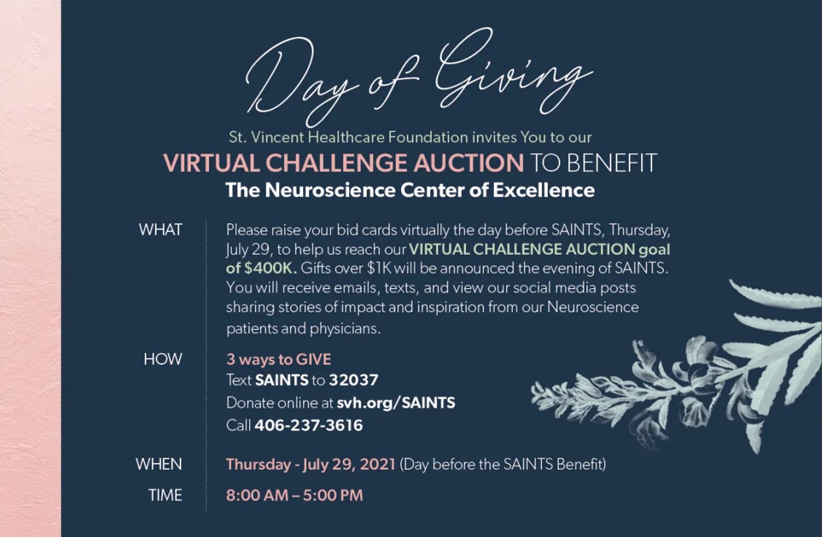 St. Vincent Healthcare Foundation invites you to their Virtual Challenge Auction to benefit The Neuroscience Center of Excellence. Their goal is to reach $400K during this annual fundraiser. Receive emails, texts, and view social media posts sharing stories of impact and inspiration from St. Vincent Neuroscience patients and physicians.