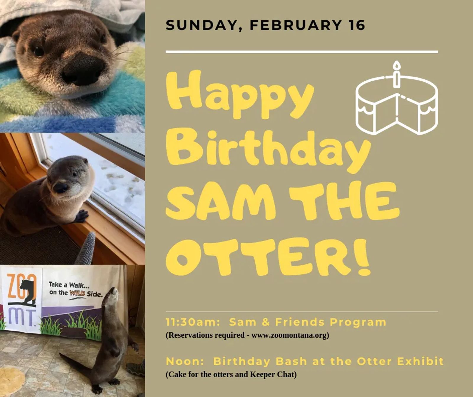 Happy Birthday Sam the Otter! Enjoy the regular Sam & Friends Program at 11:30 (Reservations Required) And a Birthdya Bash at the Otter Exhibit (Cake for the otters & Keeper chat)