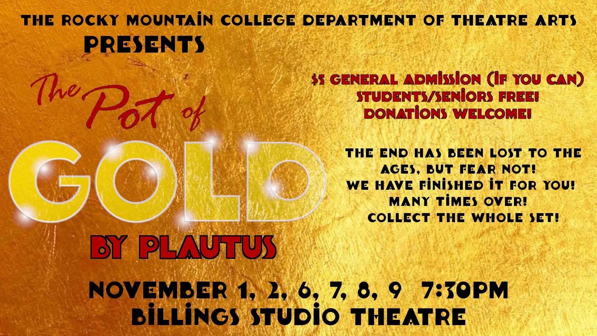 The RMC Department of Theatre Arts presents Plautus' THE POT OF GOLD, November 1, 2, 6, 7, 8, 9 at 7:30PM each night at Billings Studio Theatre.