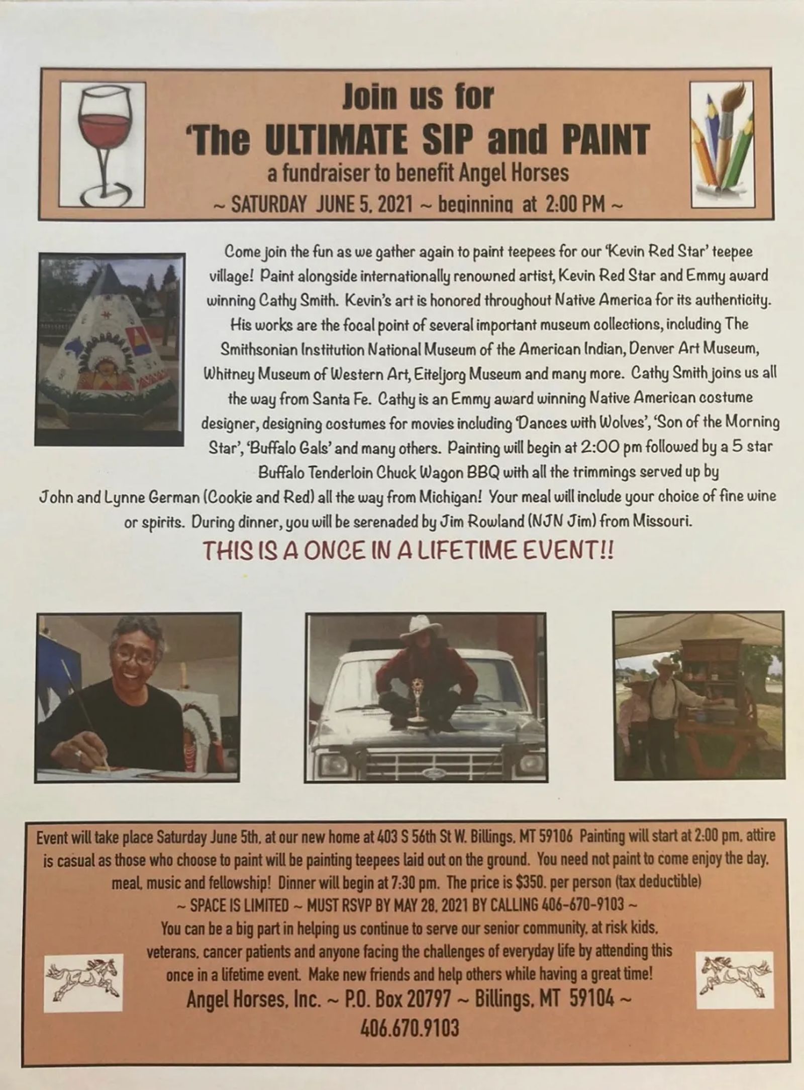 Meal, Music and Fellowship. Choose to paint ( or not) along side of internationally renowned artist, Kevin Red Star and Emmy award winning Cathy Smith. Painting begins at 2:00, 5 star dinner at 7:30 with music by Jim Rowland from Missouri. Must RSVP by May 28 by calling 406-370-9103.