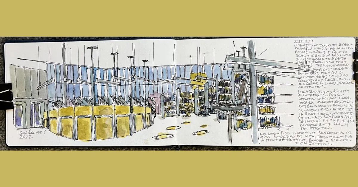 And it doesn't stop in the winter months. Indoor spaces can provide unique opportunities for sketching; whether it be from coffee shops, public spaces, your kitchen table, or the view out your living room or car window. The tools, strategies, and inspiration are the same; but indoor spaces can be challenging in a number of ways.