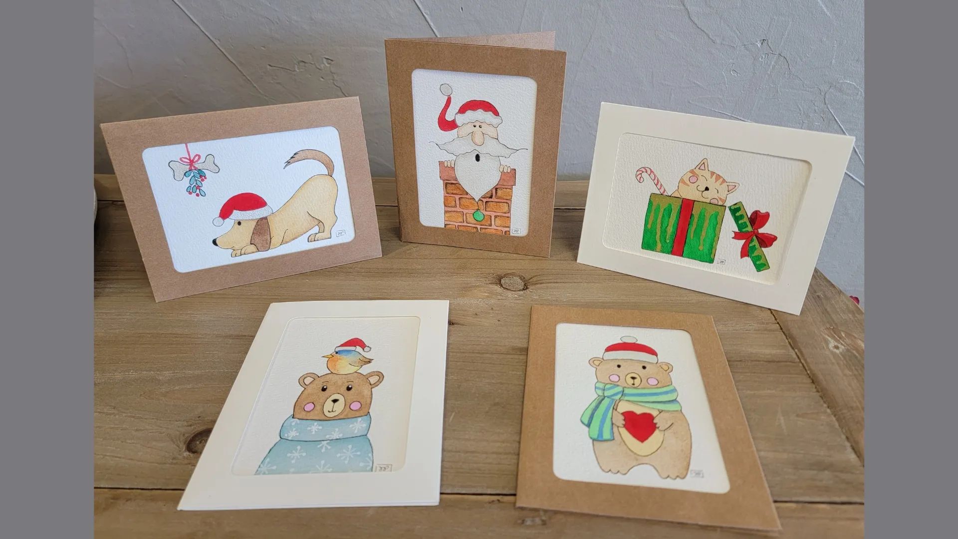Create 4 whimsical watercolor Christmas cards step-by-step. Trace your images and choose your own colors. This is great class for beginners, as well as kids. Children 11 and under need to be accompanied by an adult. All supplies provided including envelopes.