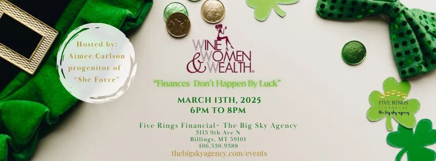 Wine, Women and Wealth, is part of our women’s social network at Five Rings Financial | The Big Sky Agency. We are building a community of women who desire to take charge of their financial future, expand their knowledge, and build their confidence regarding money and wealth. Amazing things happen when women team up. Whether you’re at the beginning of your journey or the top of the corporate ladder, there is always more to learn about how you can make your money work for you. Please register online.